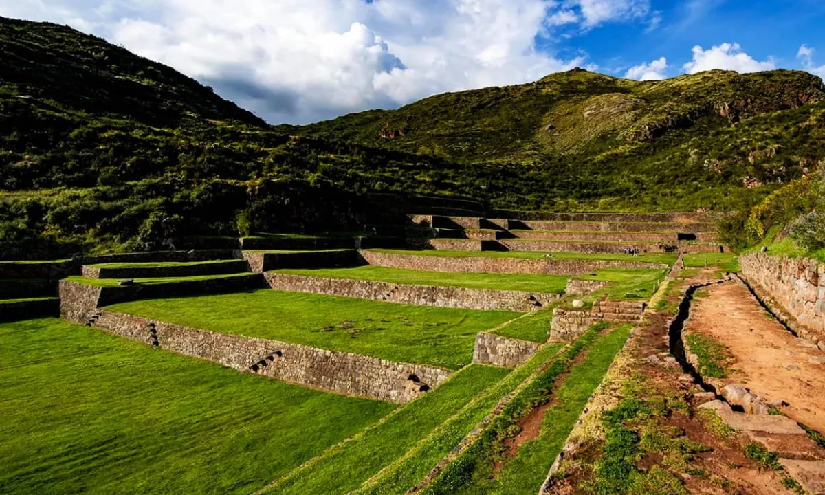 Tipón, considered a royal garden commissioned by Wiracocha, is one of the finest examples of Inca agricultural terraces. These terraces, fed by natural springs from the Apu Pachatusan, stretch across a narrow valley and are part of a complex that includes temples, irrigation channels, and aqueducts. The site is located 24 km southeast of Cusco.